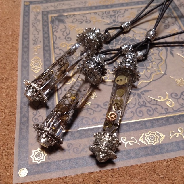 カラー:シルバー系 主素材:UV硬化性レジン、金属パーツ、ワックスコード ラッピング素材:化粧箱 モチーフ部サイズ:全長約75mm×横幅約15mm×最大厚約15mm コード長さ:約70cm(成型前紐長80cm) ※コードは+100円でワックスコード(1m)またはメタルチェーンへ変更可能です。ご希望の方はご購入前にお問い合わせ下さい。 ୨୧┈┈┈┈┈┈┈┈┈┈┈┈┈┈┈┈┈┈୨୧ テーマ 【傾国の魔導師の杖】のセルフオマージュペンダント ୨୧┈┈┈┈┈┈┈┈┈┈┈┈┈┈┈┈┈┈୨୧ 【傾国の魔導師の杖】を、もっと身近なアクセサリーに落とし込む、というテーマをかかげ、セルフオマージュ作品のペンダントを仕立てました。 シルバーのパーツを組み合わせて仕立てた大振りなペンダントトップで、着色レジンを2種類ずつ使用することでファンタジーアイテム感を演出しました。 合わせる服をやや選ぶアイテムですが、普段使いにもコスプレにも向く作品かと思います。 ୨୧┈┈┈┈┈┈┈┈┈┈┈┈┈┈┈┈┈┈୨୧ ⚠︎パーツの外れを防ぐため、全体に専用レジンでのコーティングを施しておりますが、強い力が加わるなどしますと破損いたしますので無理のでる環境下ではご使用はお控えください。 ୨୧┈┈┈┈┈┈┈┈┈┈┈┈┈┈┈┈┈┈୨୧