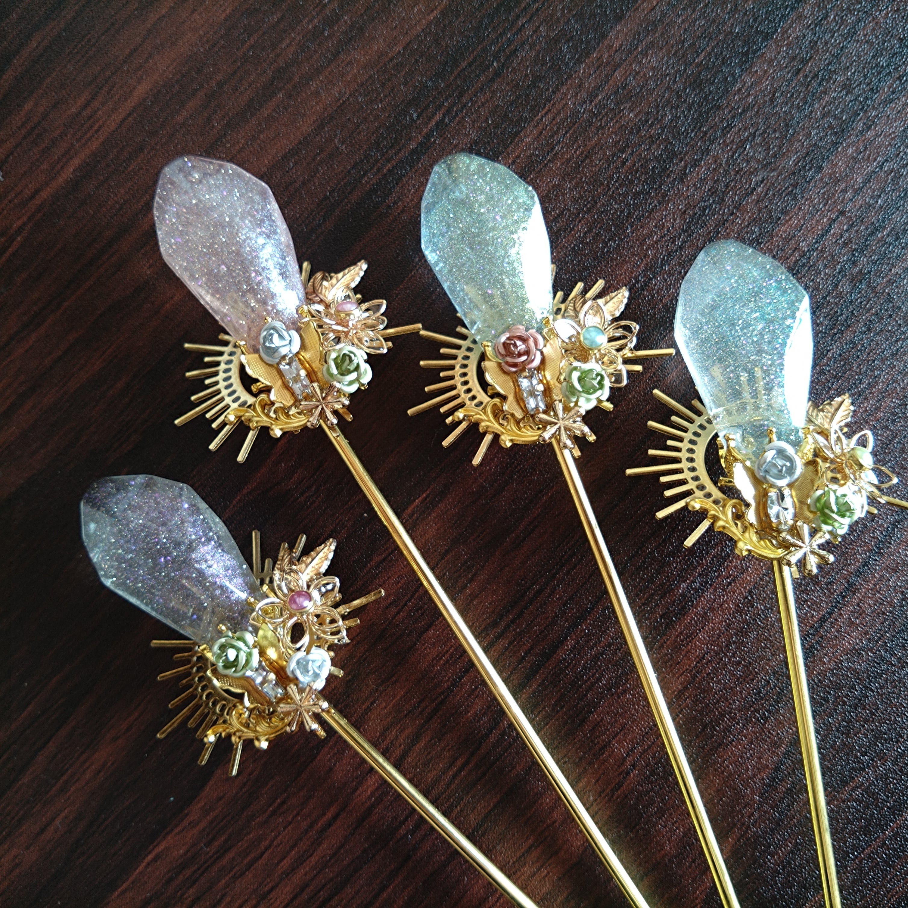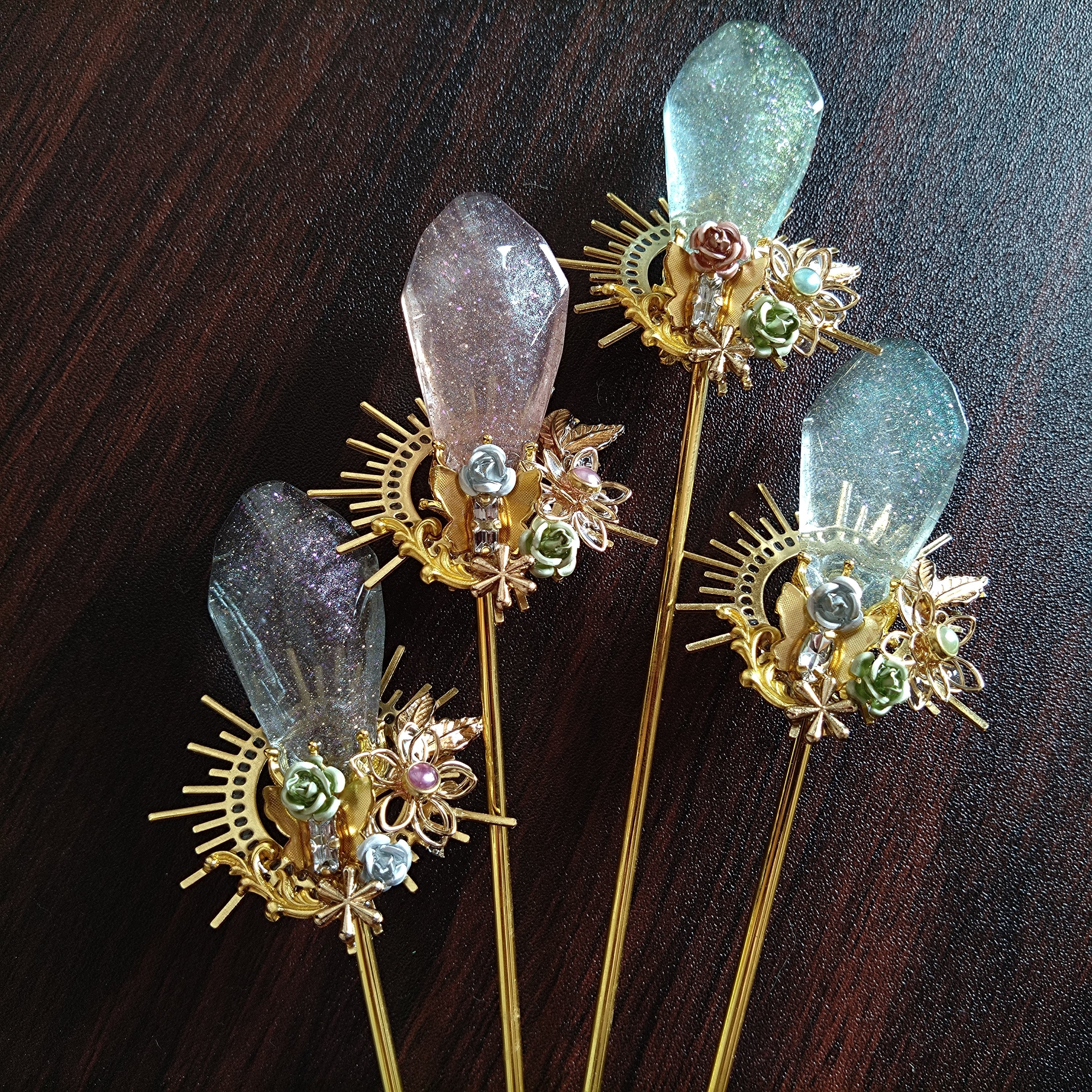 金属製の簪軸をベースにし、レジン製の結晶とメタルパーツ、ビジューなどを用いて魔法の杖風の簪を仕立てました。